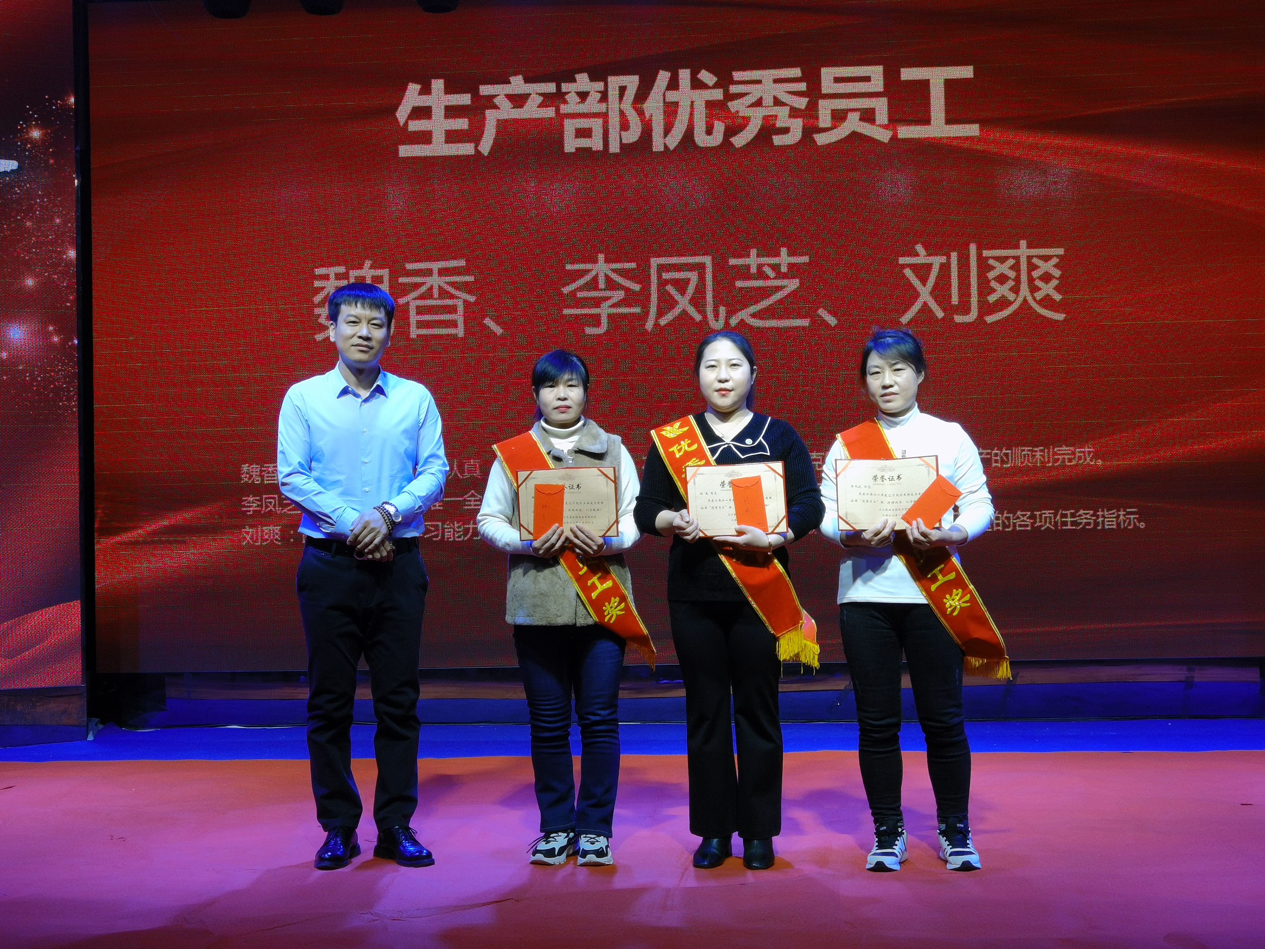 魏香、李鳳芝、劉爽獲得生產(chǎn)部優(yōu)秀員工獎,他們生活在生產(chǎn)一線,在生產(chǎn)車間改造情況下,能夠吃苦耐勞,克服困難,積積主動,盡職盡責(zé)的工作作風(fēng)滲透到車間的每一個日子,每一個角落,他們勤勤懇懇,他們熱情洋溢,他們默默無聞地創(chuàng)造著自己的價值。公司網(wǎng)絡(luò)事業(yè)部總經(jīng)理趙福寬為獲獎?wù)?/span>頒獎。